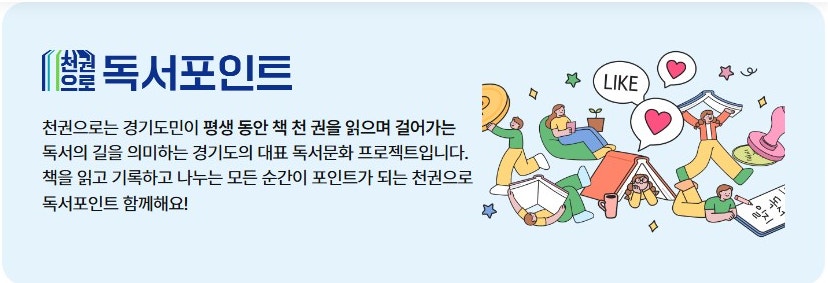 경기도가 추진하는 평생독서 프로젝트 ‘천권으로(路)’는 책을 읽고 독서 활동을 기록하면 독서 포인트를 지급하고, 그 포인트를 지역 화폐로 전환해 쓸 수 있도록 설계된 정책이에요.