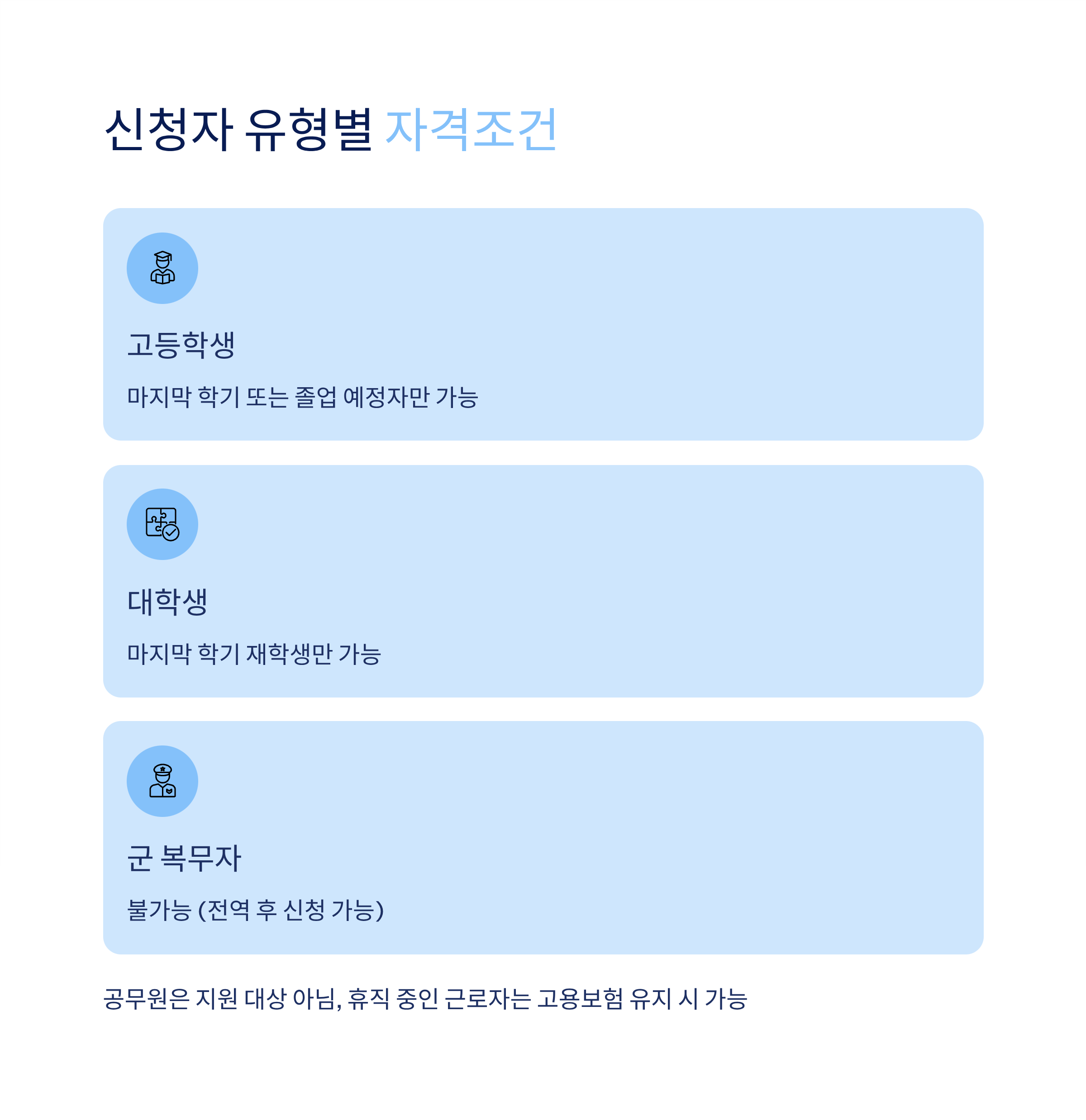 | 고등학생 | 조건부 가능 | 마지막 학기 또는 졸업 예정자 |
