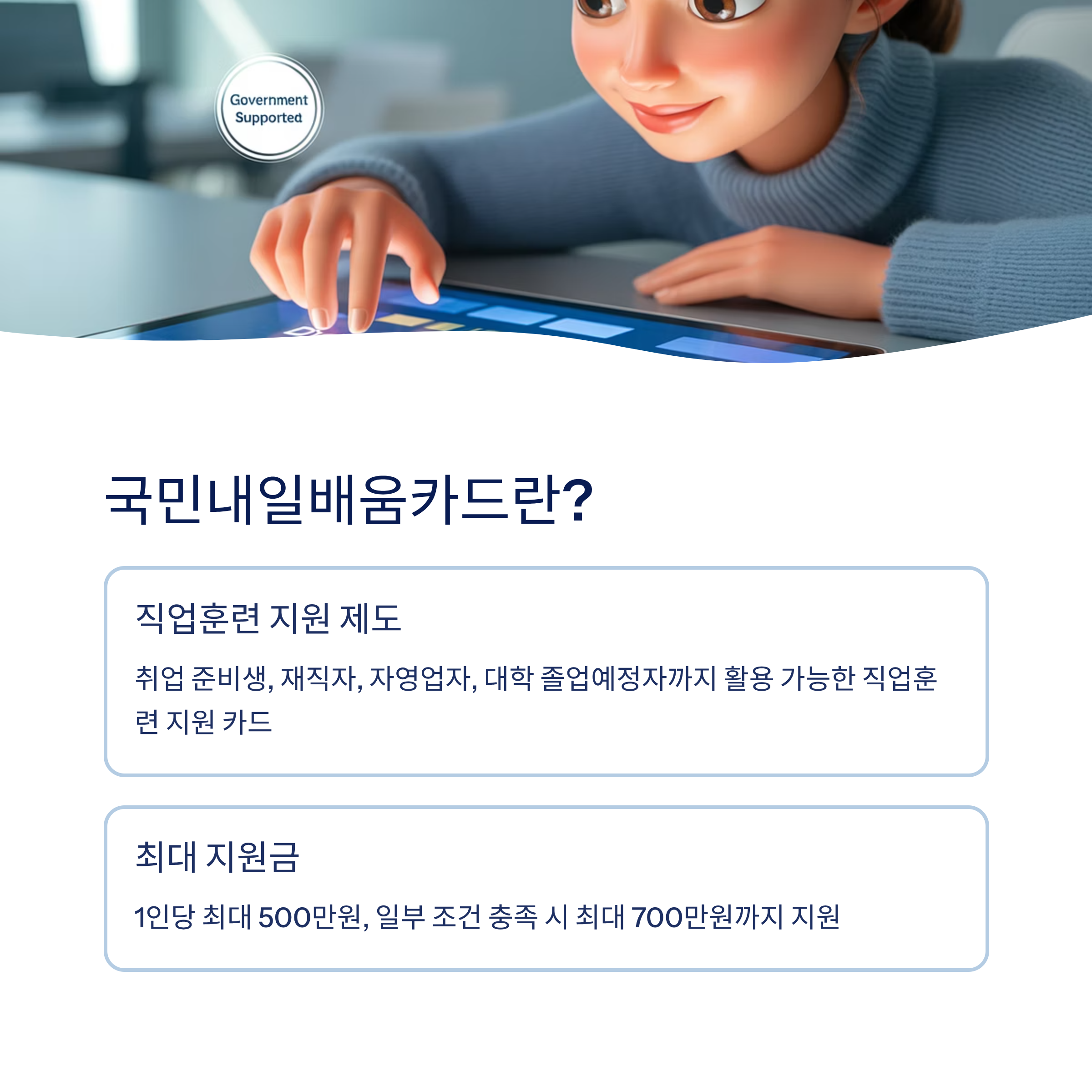 국민내일 배움 카드는 국가가 국민의 직업능력 향상을 위해 훈련비를 지원해 주는 제도예요.