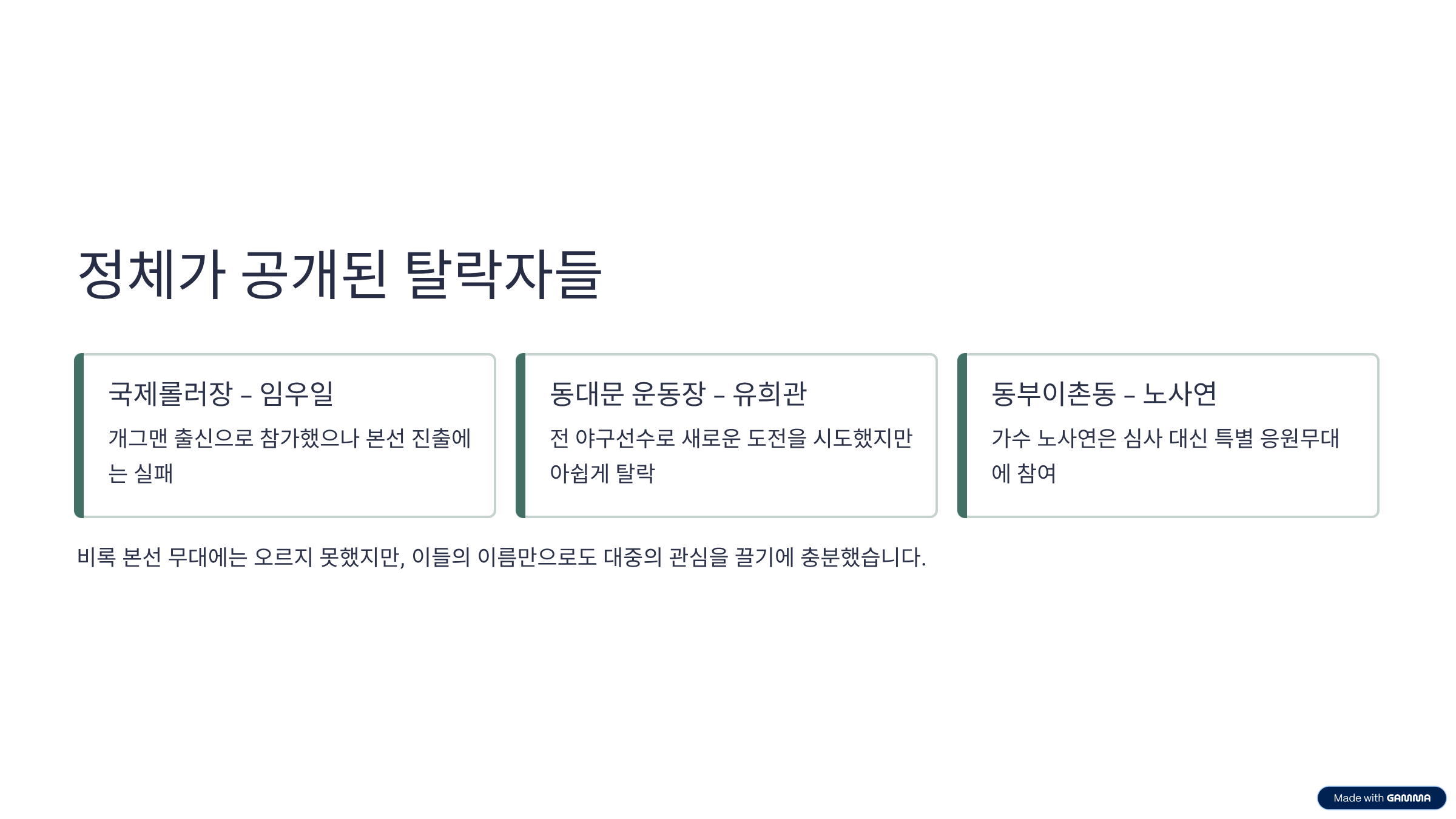 정체가 공개된 탈락자들도 화제입니다. 비록 본선 무대에는 오르지 못했지만, 이들의 이름만으로도 대중의 관심을 끌기에 충분했습니다.