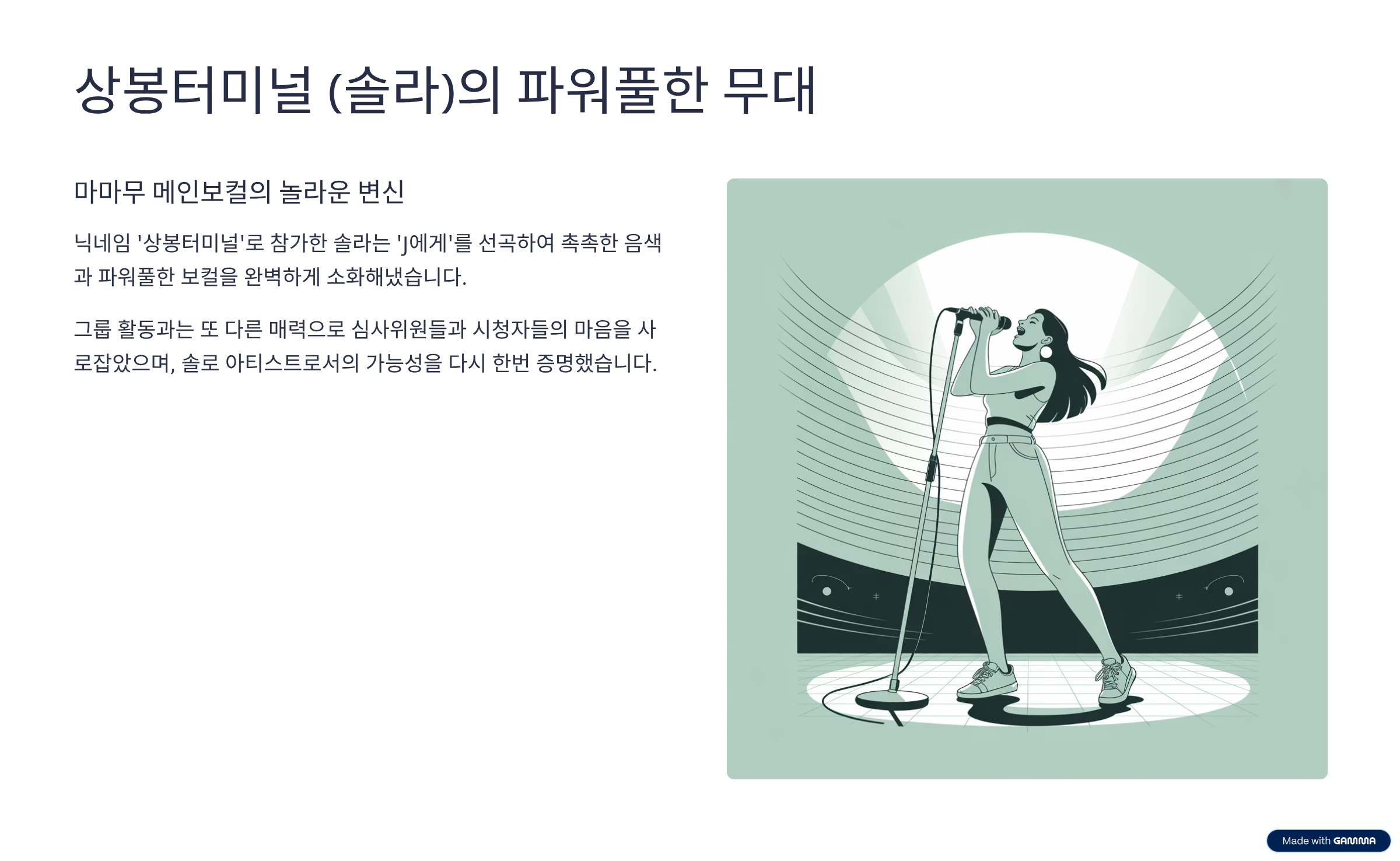 | 상봉터미널 | 솔라 (마마무) | J에게 | 촉촉한 음색 + 파워보컬, 완벽소화 |