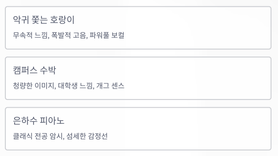 | 캠퍼스 수박 | 청량한 이미지, 대학생 느낌, 개그 센스 있는 말투 |