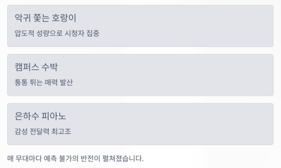 | 악귀 쫓는 호랑이 | “무대 씹어먹었다”, “진짜 정체가 궁금함” |