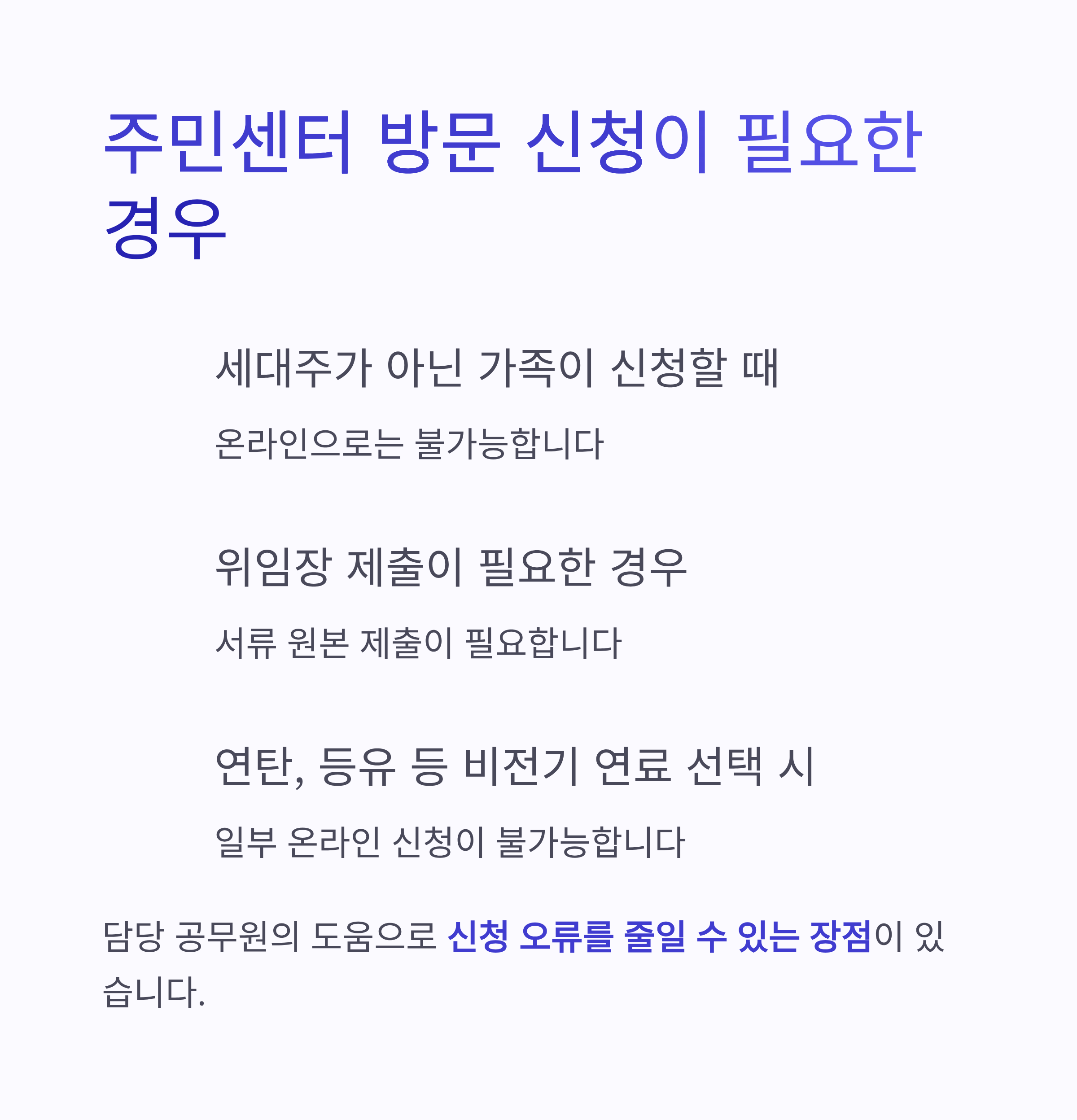 방문 시 담당 공무원이 신청 자격부터 필요 서류까지 꼼꼼하게 도와주기 때문에 신청 오류를 줄일 수 있는 장점이 있어요.