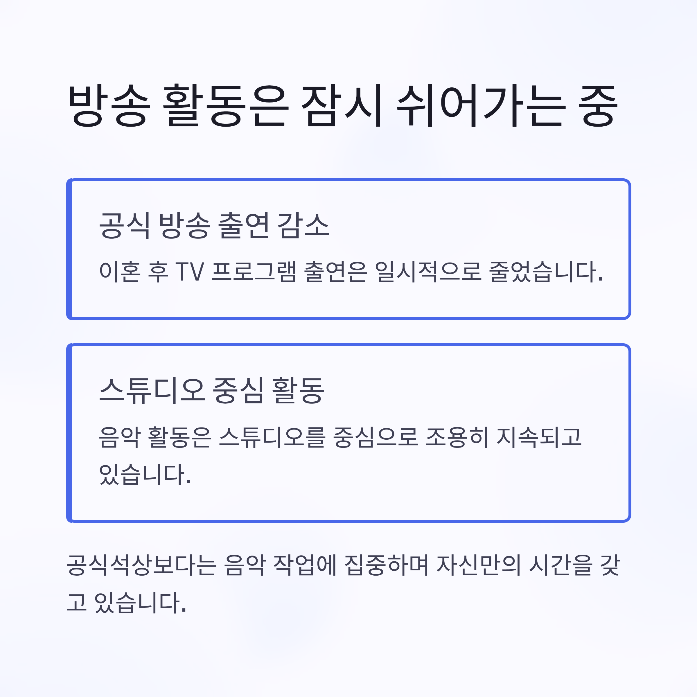 과거 가족 예능을 통해 따뜻한 이미지로 많은 사랑을 받았던 그이기에, 이혼 소식은 충격을 안겼지만 이후의 모습에서는 담담하고 조용한 변화가 느껴집니다.