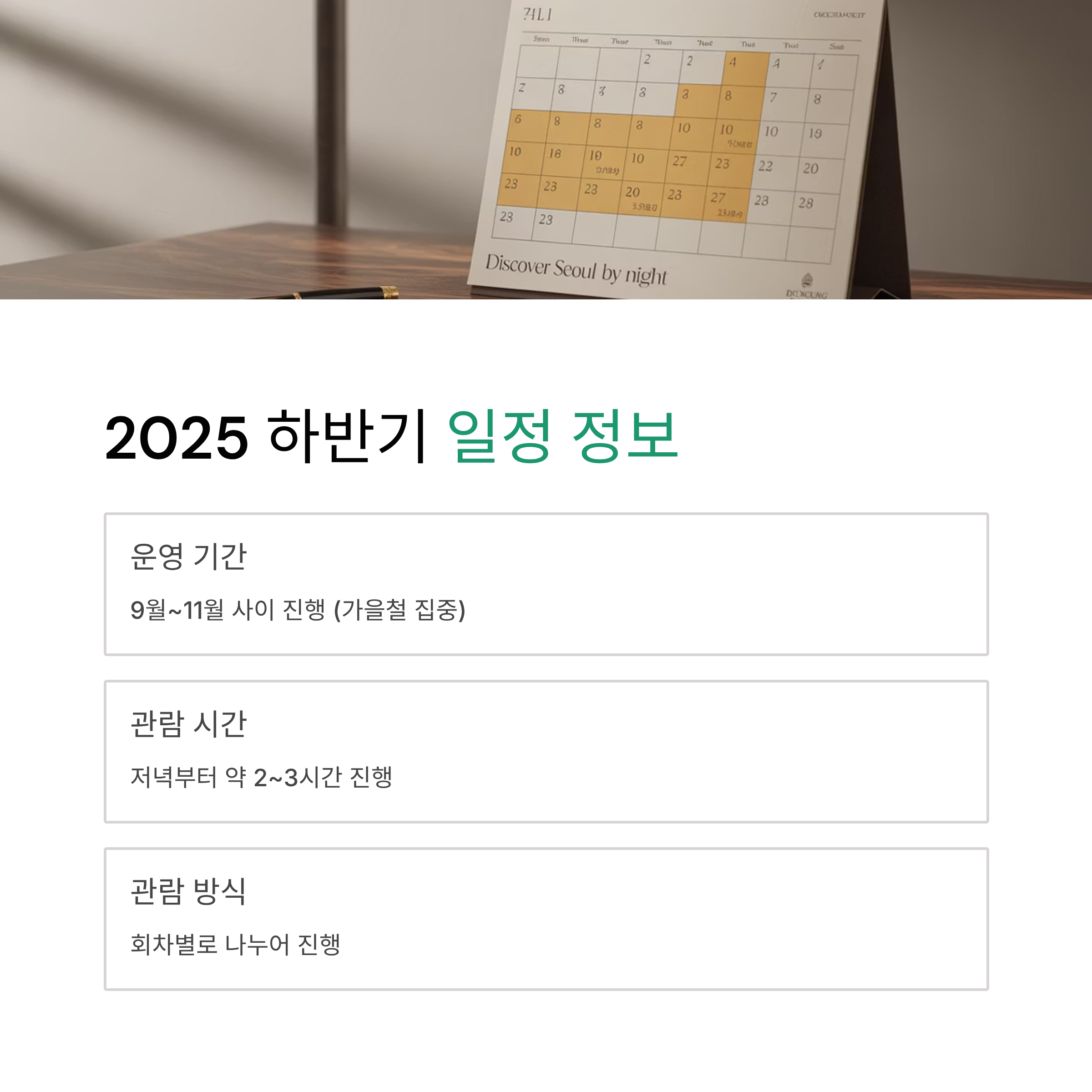 보통 하반기 야간개장은 가을철에 집중되며, 9월 11월 사이 진행되는 경우가 많습니다.