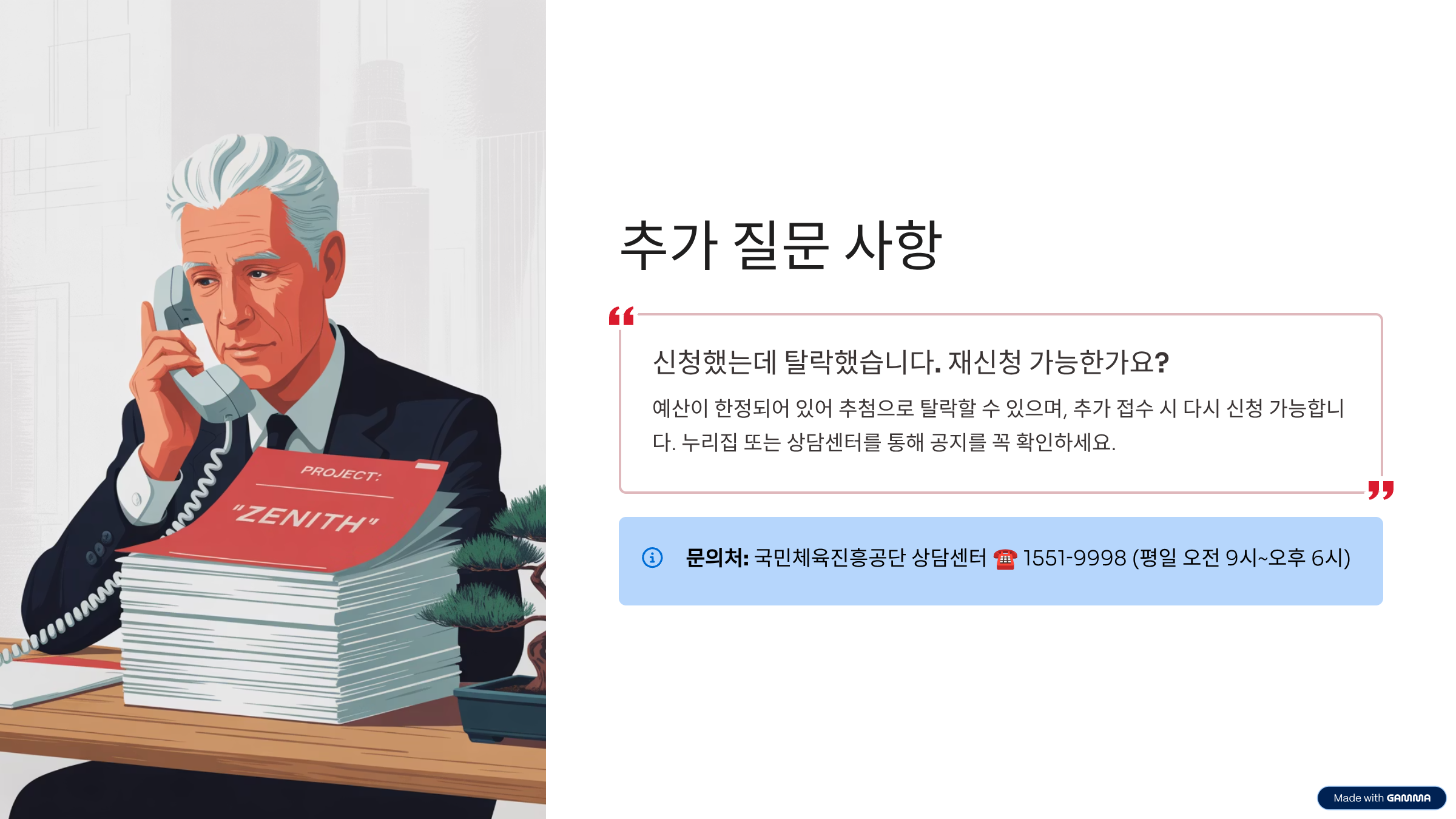 ② 전화 신청 – 인터넷 이용이 어렵다면 국민체육진흥공단 상담센터(☎ 1551‑9998, 평일 오전 9시~오후 6시)에 전화로 신청 가능합니다.