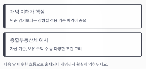 예를 들어 "종합부동산세" 문제는 자산 기준, 보유 주택 수 등 다양한 조건이 얽혀 있어
